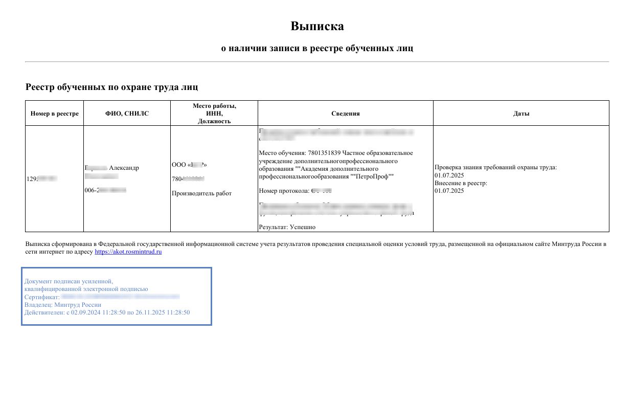 Это открывает перед выпускниками наших курсов возможности для профессионального роста и расширения сферы деятельности, включая участие в разработке программ по улучшению условий труда и профилактике рисков на предприятиях образовательного сектора.
